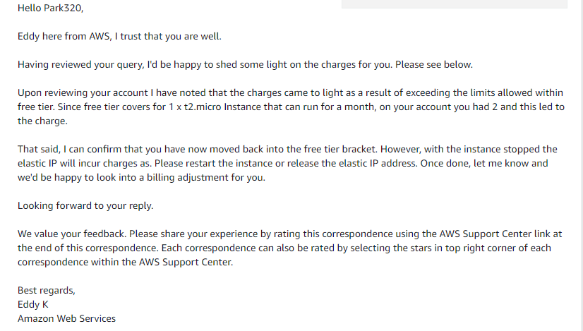 (아마 이 부분에서 문제가 생긴듯 한데, 담당자 멘트를 다시 보면 인스턴스를 중지해도 EIP에서 과금이 발생할 수 있으니 반납하라고 했으나 연결만 끊으면 되는 걸로 착각해서 더 진행하지 않았음)