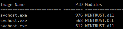 수행 중인 프로세스 확인 tasklist /m wintrust.dll
