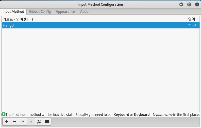 - "Input Method Configuration" 이란 새로운 창이 뜨고 Input Method 탭에 "Hangul"이 나타난 것을 확인할 수 있다.