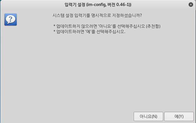 - 위 명령어 실행하면 창이 뜨는데 "확인", "예", "fcitx" 를 선택