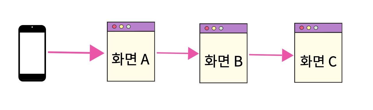 일반적으로 안드로이드 앱이 실행하면 화면 A, 화면 B를 거쳐 화면 C를 호출하게 된다. 화면 C는 반드시 화면 A, B를 거쳐야 호출 가능.