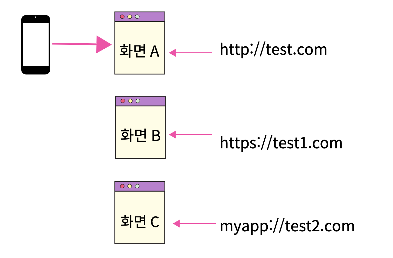 그러나 위와 같이 화면 A > B > C 를 거치는 흐름이 아니라 각 화면 URL이 아래와 같다면 각 링크를 클릭 시 '앱이 실행되면서' 해당 화면으로 바로 이동할 수 있다. 다만, "앱이 반드시 설치"되어 있어야 한다. 앱이 설치되어 있지 않다면 앱을 설치할 수 있도록 마켓으로 이동하게끔 할 수 있으나 앱 설치 후 실행하더라도 해당 링크의 콘텐츠로 이동은 불가하다.