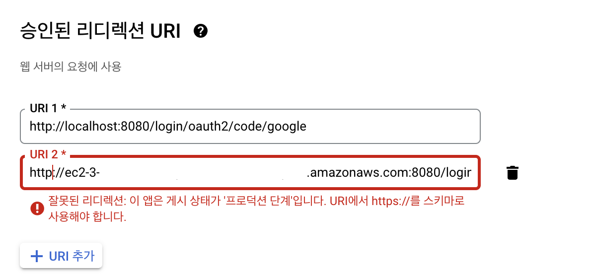 우선 구글 로그인 사용을 위해 책에서 안내하는 대로 [ 사용자 인증 정보 > 승인된 리디렉션 URI ] 에서 등록을 하려는데 아래와 같이 붉은 메시지를 띄우면서 진행이 되지 않는다!! 내용인 즉슨... http가 아닌 https로 등록을 하라는 것인데.... 그럴라믄.. 인증서 발급받아서 적용해야하는디...;;