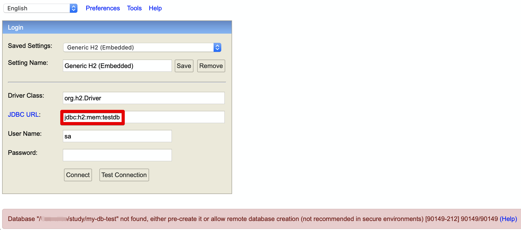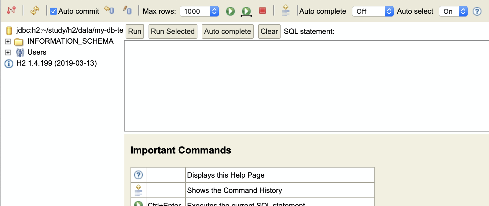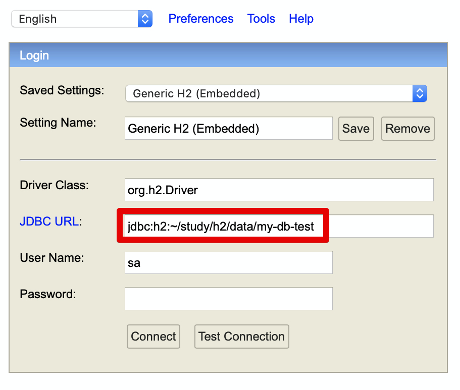 ex) jdbc:h2:~/study/h2/data/my-db-test
