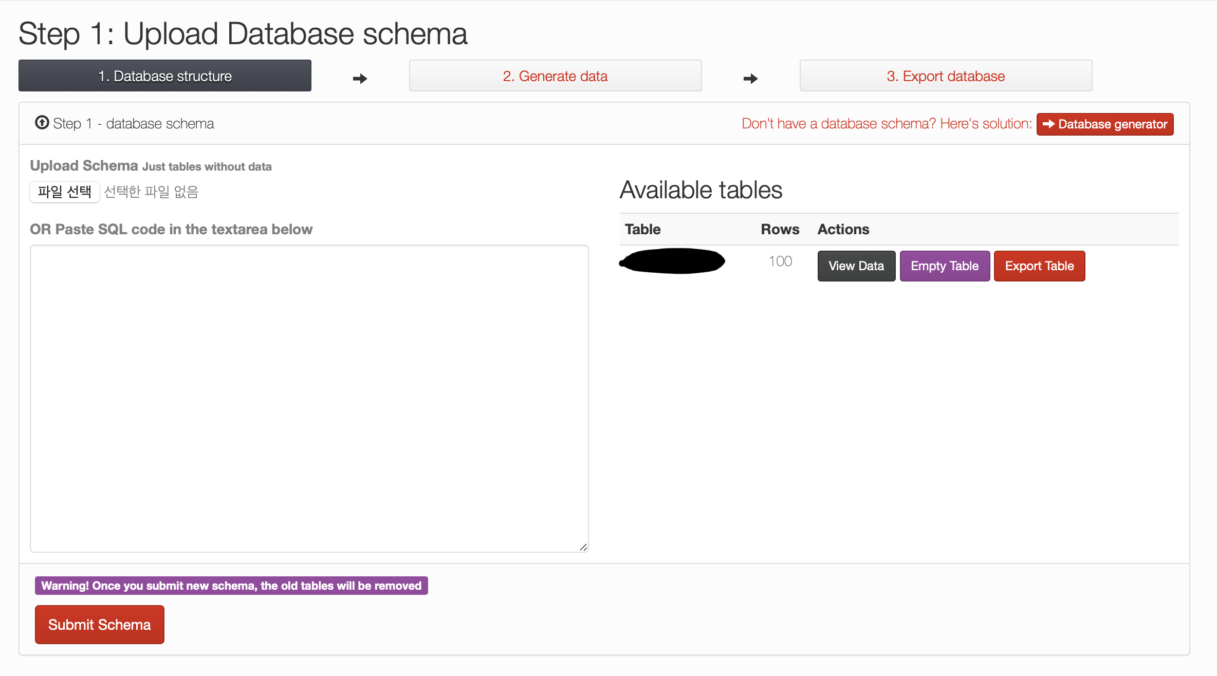 text area에 직접 create 문으로 스크립트 작성할 수도 있고, 우상단 "Database generator" 를 통해서 테이블 스키마를 GUI로 생성할 수도 있다.