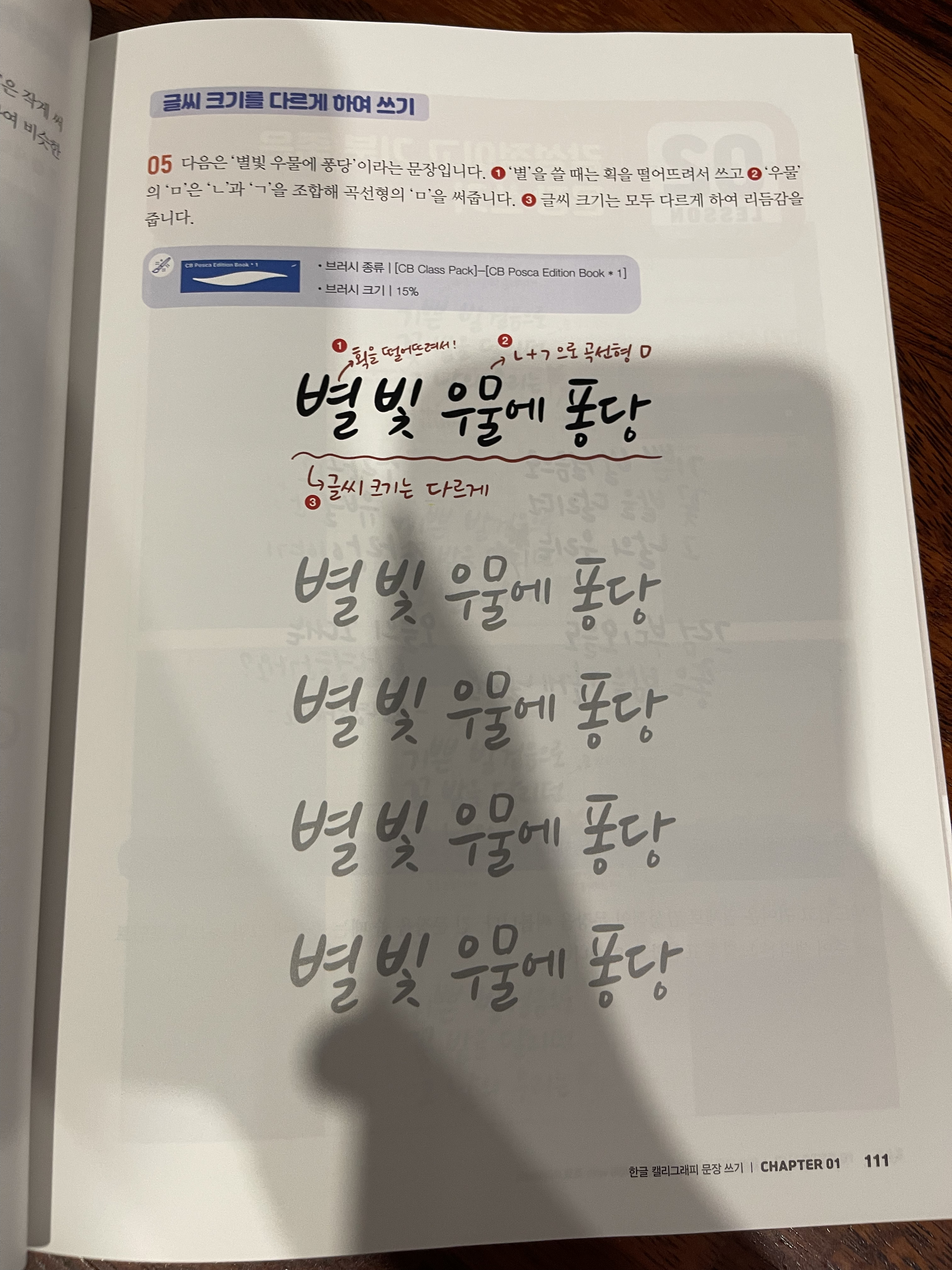 캘리그래피의 꽃이라 할 수 있는 글씨 쓰기는 미리 준비된 교정본을 따라 써보며 글씨체를 익힐 수 있게 되어 있다.