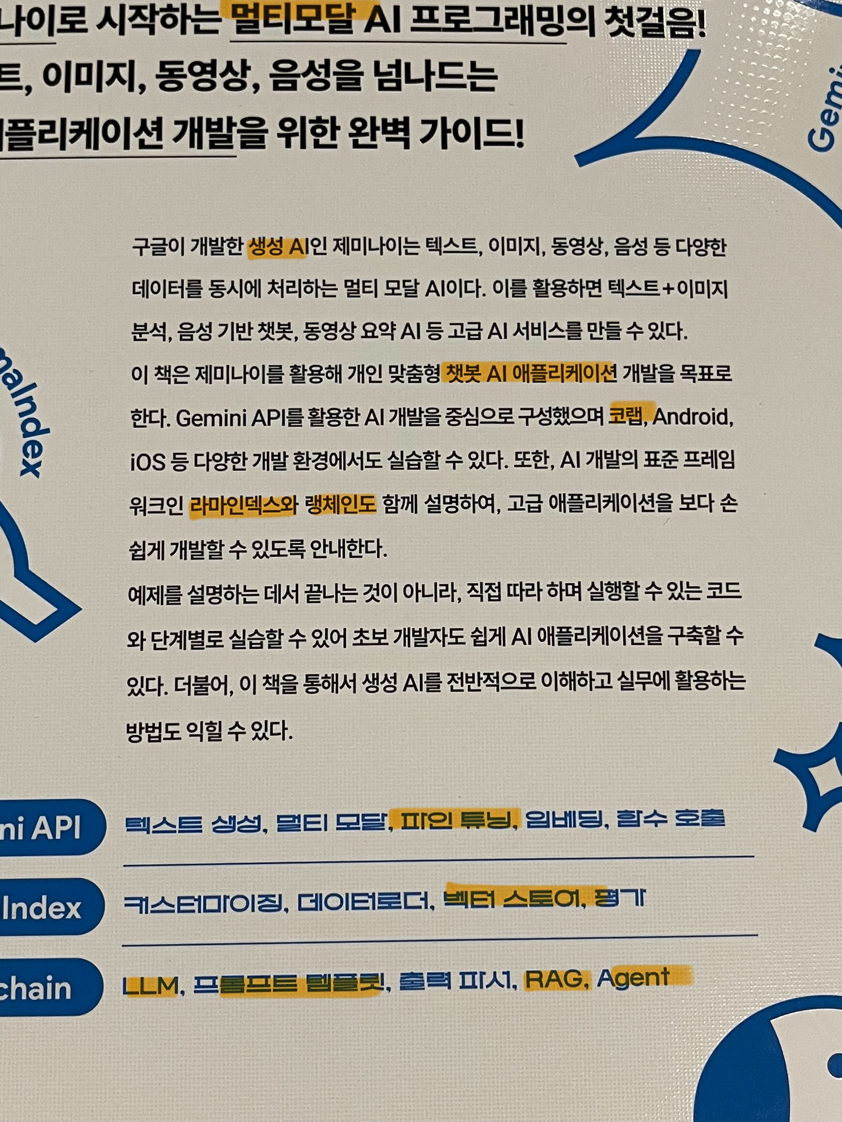 이 책은 구글의 “제미나이” 활용해서 AI 서비스를 만드는 것에 초점을 두고 설명을 이어 나갑니다.